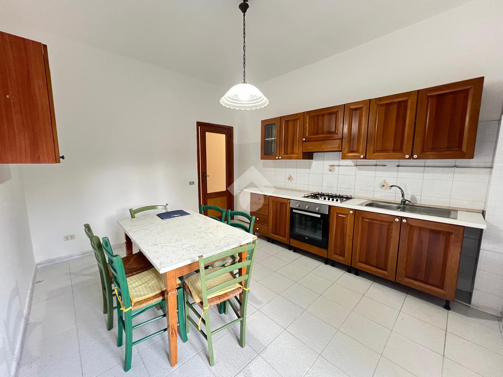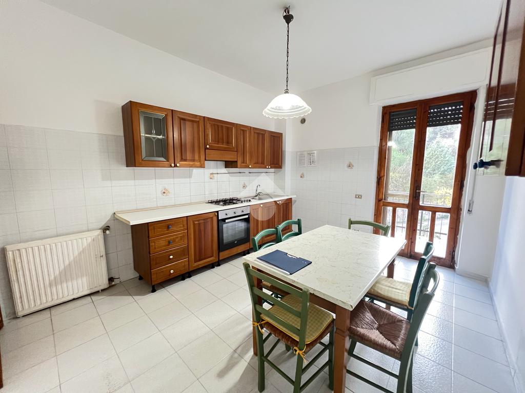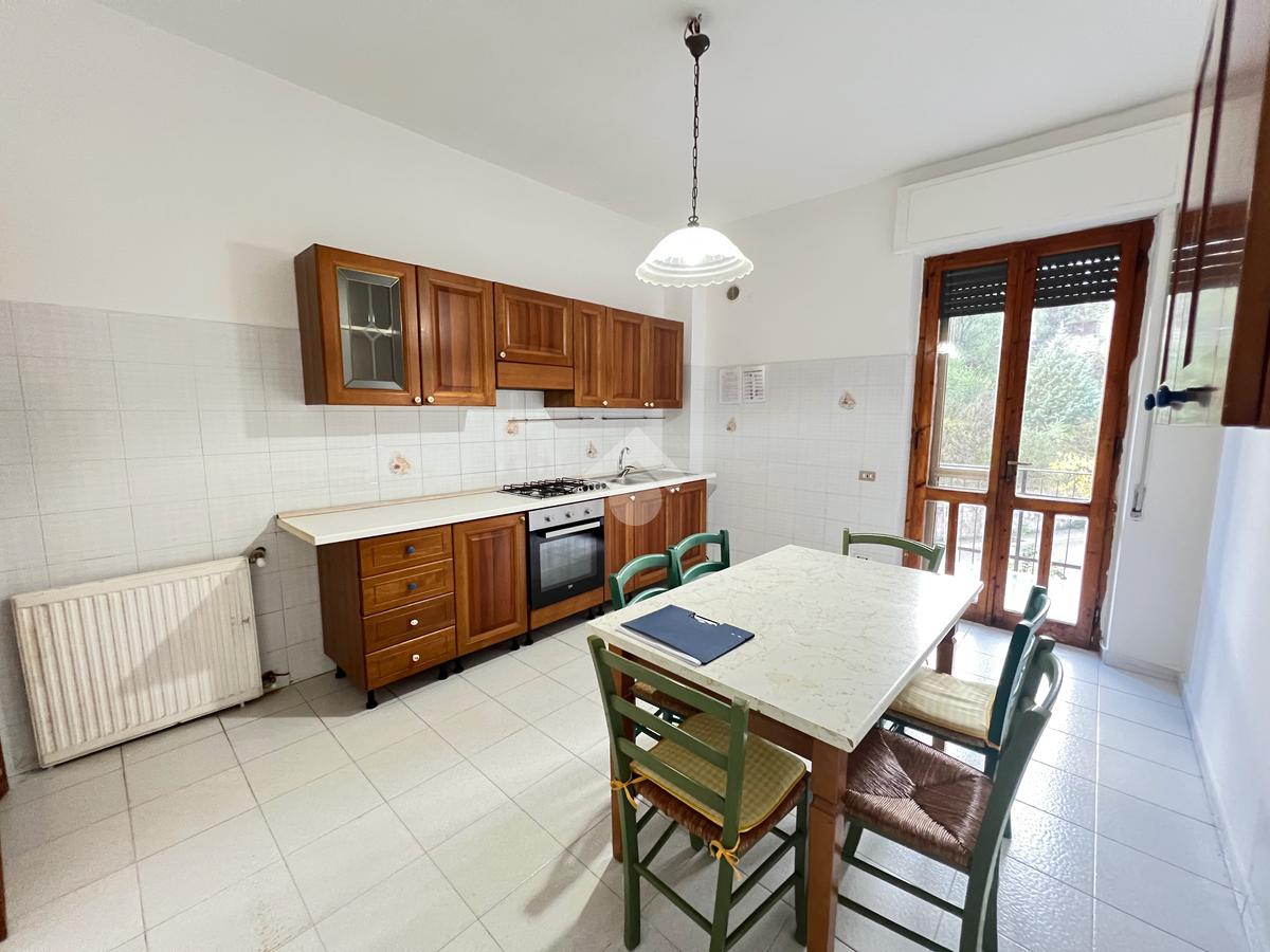 Sulla destra troviamo un ampio soggiorno con affaccio su balcone angolare, mentre proseguendo si accede alla spaziosa cucina abitabile con sala da pranzo, anch'essa servita da balcone con affaccio sulla strada.