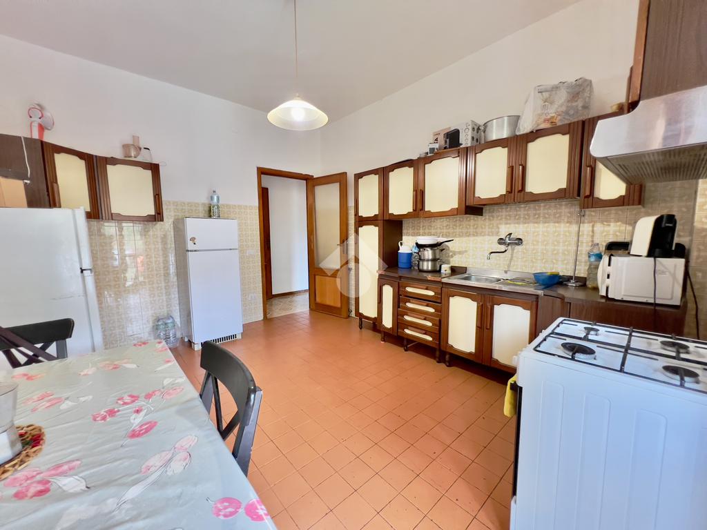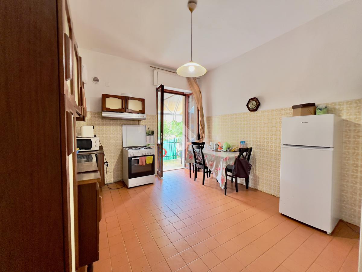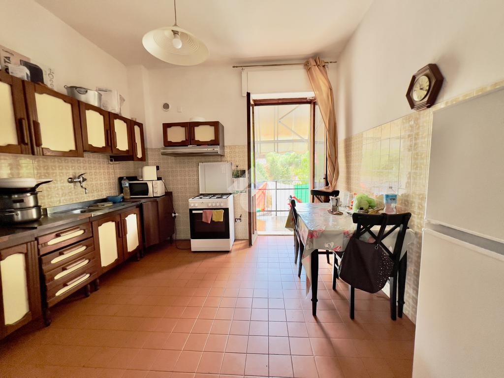 Sulla destra troviamo un ampio soggiorno con affaccio su balcone angolare, mentre proseguendo si accede alla spaziosa cucina abitabile con sala da pranzo, anch’essa servita da balcone con affaccio sulla strada.