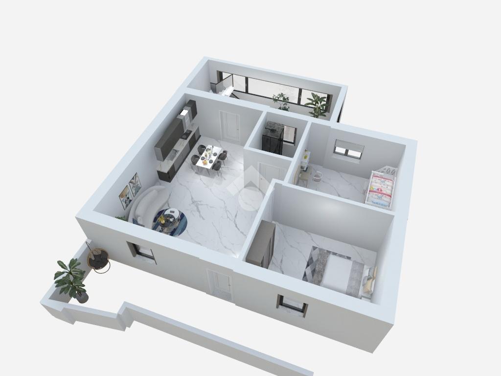 Un cancello con piccoli gradini conduce a una spaziosa terrazza di circa 20 mq con affaccio sulla strada, che precede l’ingresso dell’abitazione.
